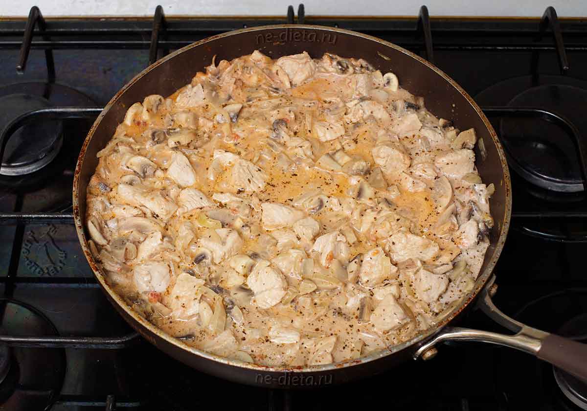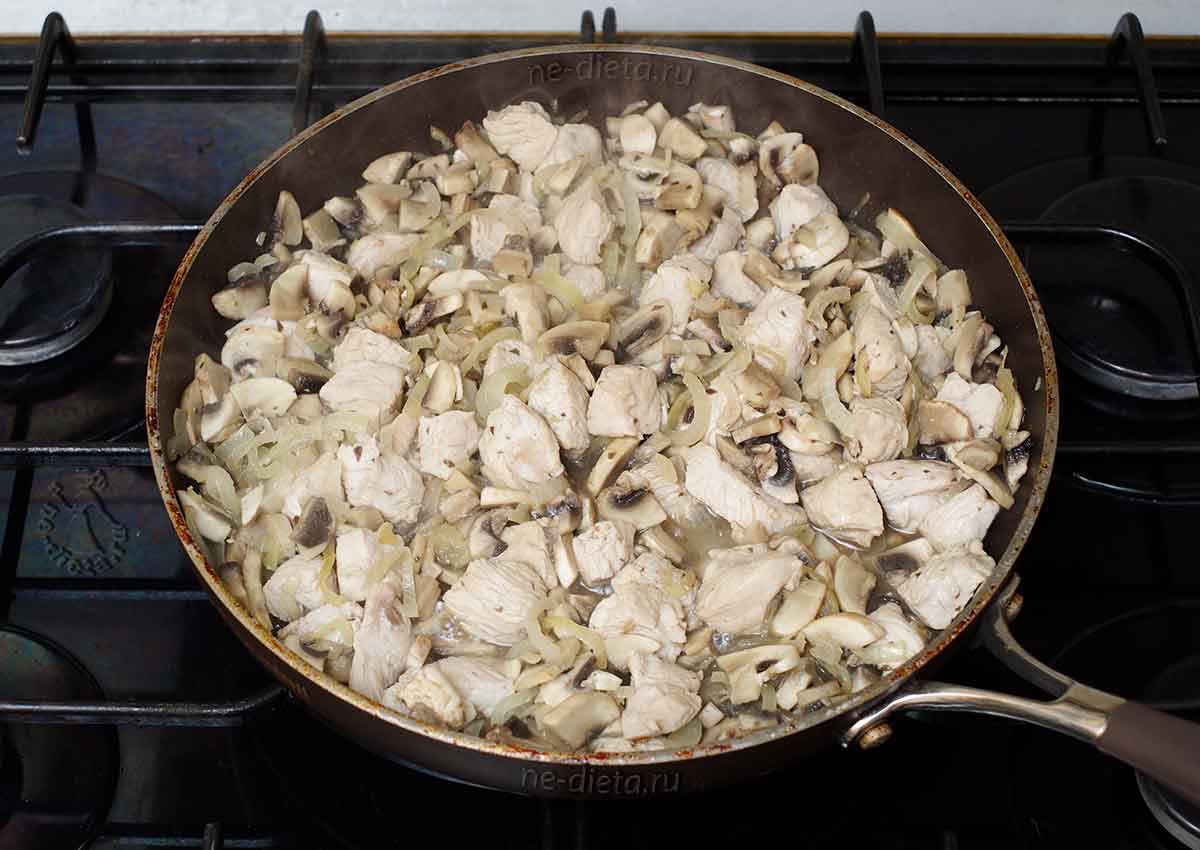 9. К индейке с луком выложить подготовленные грибы и тушить блюдо на огне чуть выше среднего в течение 10 — 12 минут до выпаривания большей части жидкости.