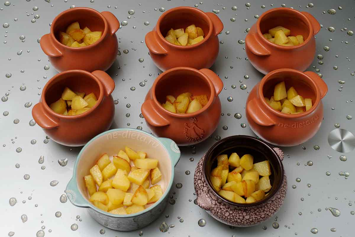 6. Подготовленную таким образом картошку надо уложить на дно порционных горшочков либо, если вам не хочется возиться с порционной посудой, можно использовать казан или любую толстостенную утварь, подходящую для использования в духовке.