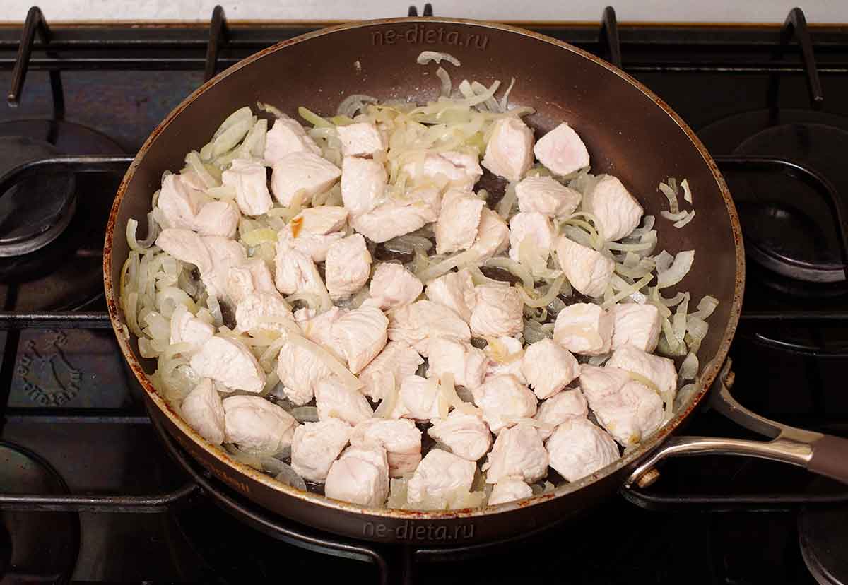 7. В той же сковороде, где жарилась картошка, теперь надо обжарить и репчатый лук. Готовить его следует на среднем огне, изредка помешивая, до мягкости и легкого подрумянивания в течение примерно 10 минут. Если картошка впитала в себя почти все масло, тогда следует подлить еще пару ложек на сковороду, иначе лук подсохнет и может пригореть. 8. Затем в сковороду положить мясо и жарить все вместе еще 5 минут при постоянном помешивании до тех пор, пока вы не увидите, что кусочки индейки со всех сторон побелели.