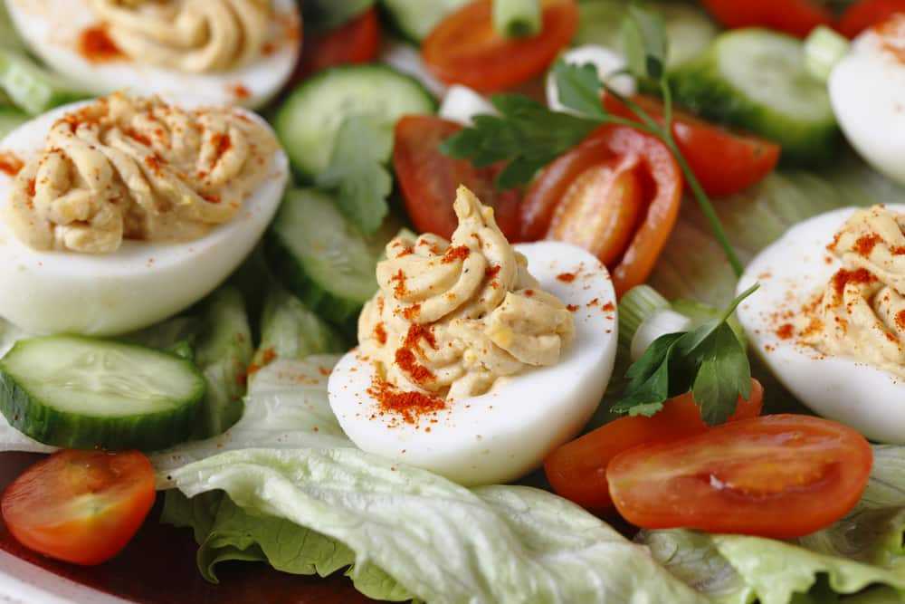 Начиним смесью половинки белков. Украсим копченой паприкой и (или) зеленью.