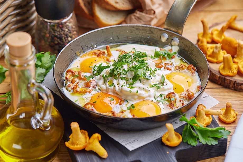 Нарядная яичница с лисичками – то, что нужно в осенний денек. Она такая красивая и вкусная! Грибы и яйца дают очень интересное сочетание, но оно было бы не столь великолепным, если бы не сыр страчателла! Это настоящий сырный деликатес, очень нежный и деликатный, который сейчас можно купить во многих сырных лавках и в супермаркетах. Рецепт из копилки бренд-шефа ресторана «Сыроварня» Сергея Носова.