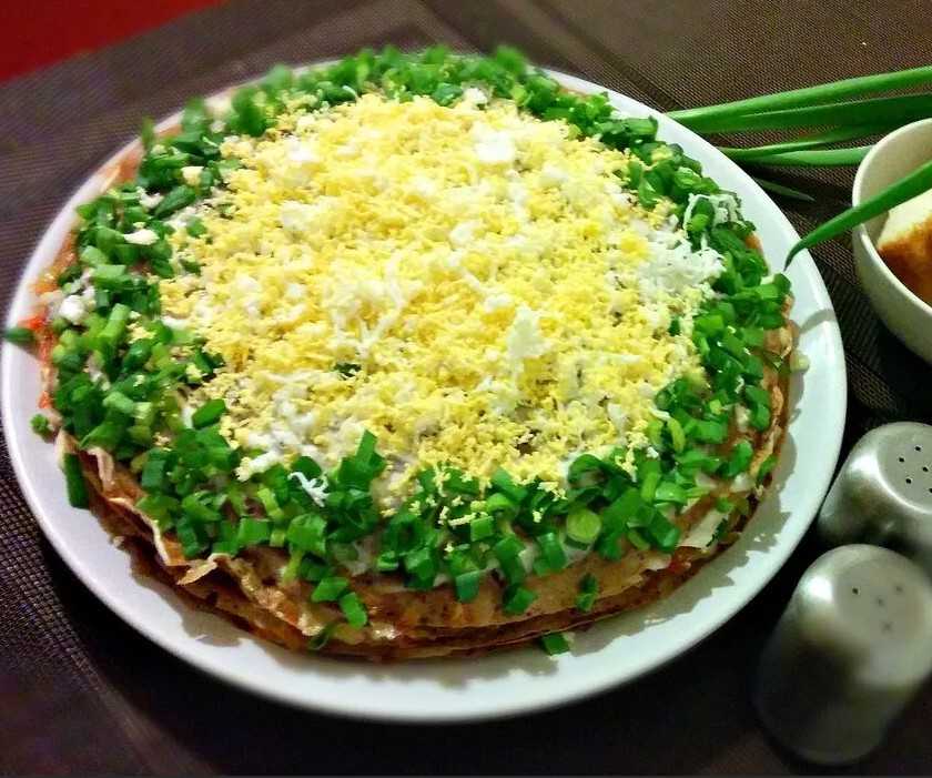 10. Таким образом выкладываем все блинчики, промазывая их майонезом и прослаивая начинкой. Последний блинчик просто смажем майонезом.