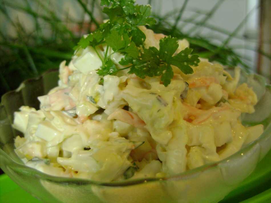 - Салат заправляют майонезом и сметаной, перемешанных поровну