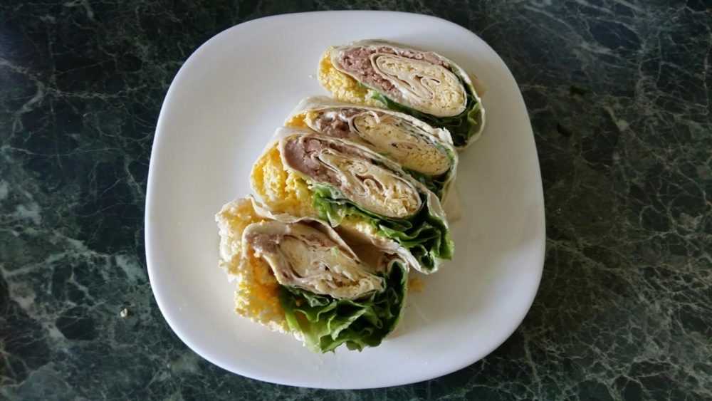 - Лучше всего выбирать лаваш больших размеров. Теперь начинаем выкладывать начинку слоями на наш будущий рулет.