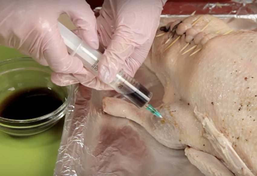 Объясню вам, дорогие читатели. Утку мы готовим в открытом виде без фольги или рукава. Такой способ запекания сушит мясо. Поэтому смешайте 2 ст.л. воды с 2 ст.л. соевого соуса. Обычным шприцем введите состав в ножки и в грудку.