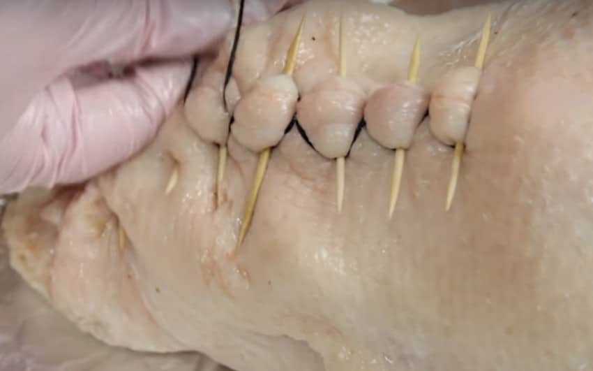 5. Далее брюшко следует зашить или заколоть зубочистками — это как вам будет удобнее.