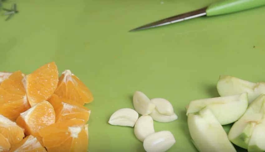 4. Нарезанными мандаринами, яблоком и чесноком нафаршируйте птицу. По желанию поместите внутрь тушки веточку тимьяна, розмарина и палочку корицы.