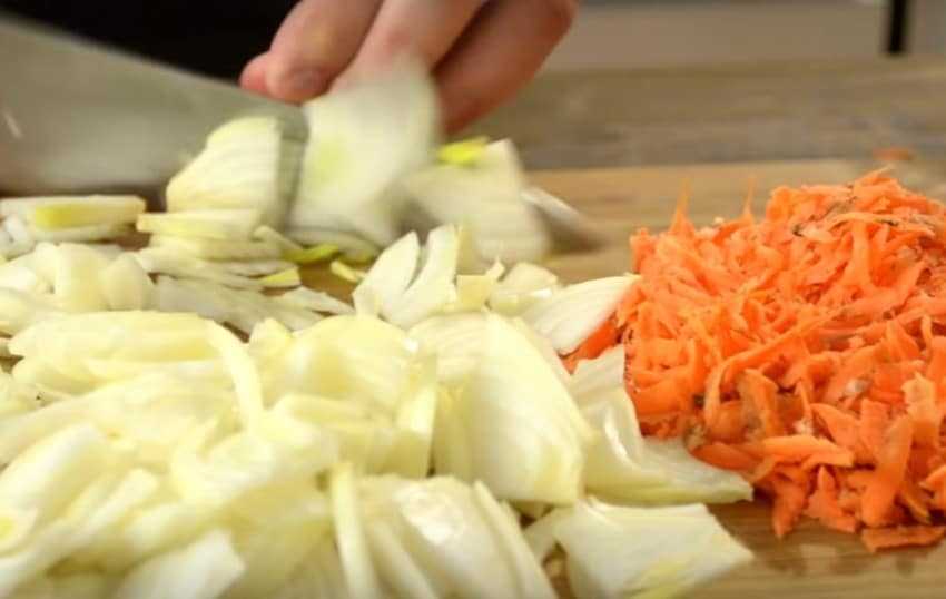 1. Начните приготовление с начинки. Лук нарежьте кубиками, морковь натрите на крупной терке.