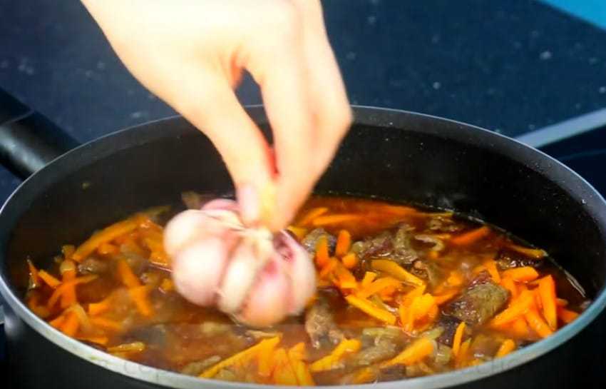 После обжаривания положить очищенные зубчики чеснока, соль, приправы, промытый рис.