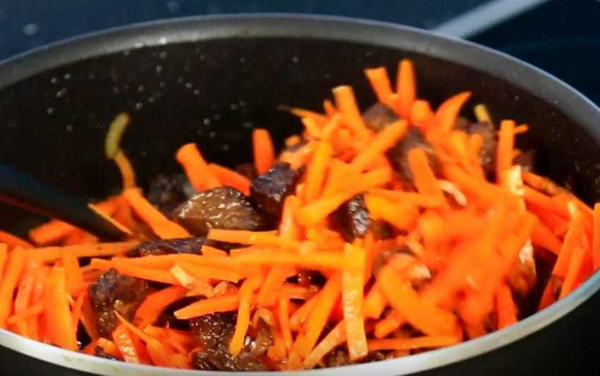 6. Когда воды в казане не останется, или останется совсем на дне, всыпать морковь.