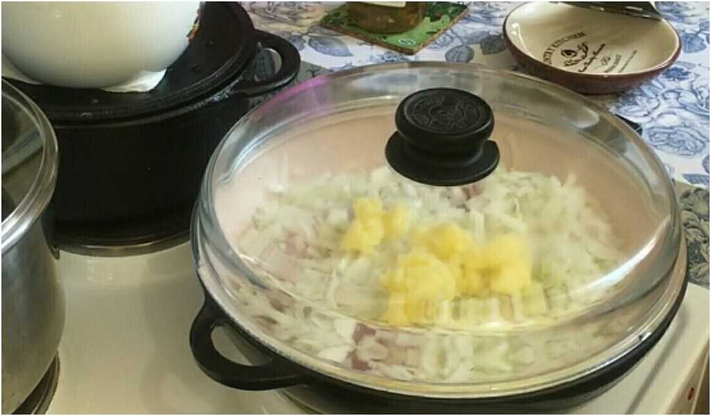 Тем временем подготовим лук. Поджарим его до легкой золотистости и когда он подрумянится, добавим к нему кусочек сливочного масла.