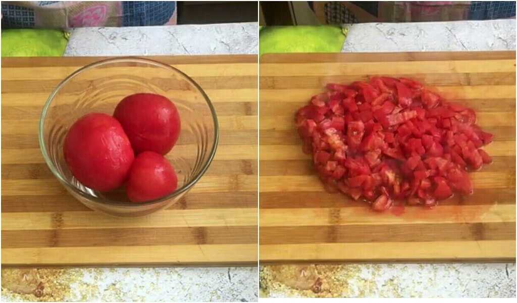 Снимите кожицу с помидоров и нарежьте их небольшими кубиками.