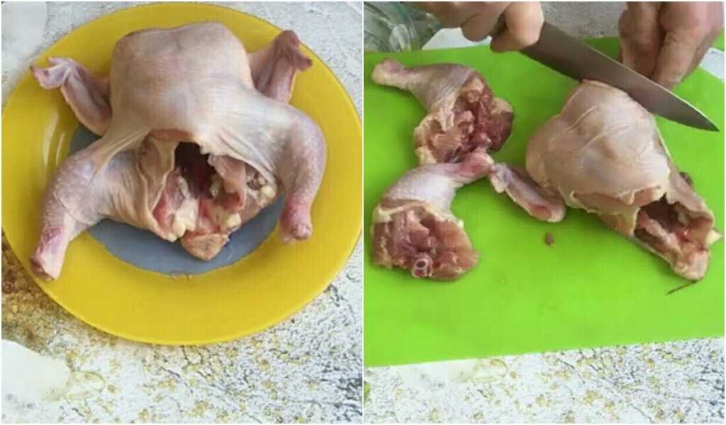 Мельчить ее не нужно! Разделим пополам, удалим хребет и первую фалангу крылышка (они пойдут на бульон), а каждую половинку поделите на 6 частей. Если разрезать курицу по суставам, то разделать ее можно на раз-два, любым даже самым маленьким ножом. Суставы легко можно нащупать пальцами.