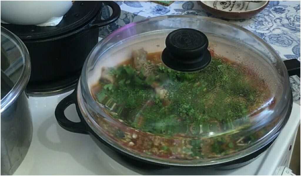 - Добавляем сначала чеснок и перец, готовим 5 минут под крышкой, затем кладем зелень. Выключаем огонь и оставляем настояться на 5–10 минут.
