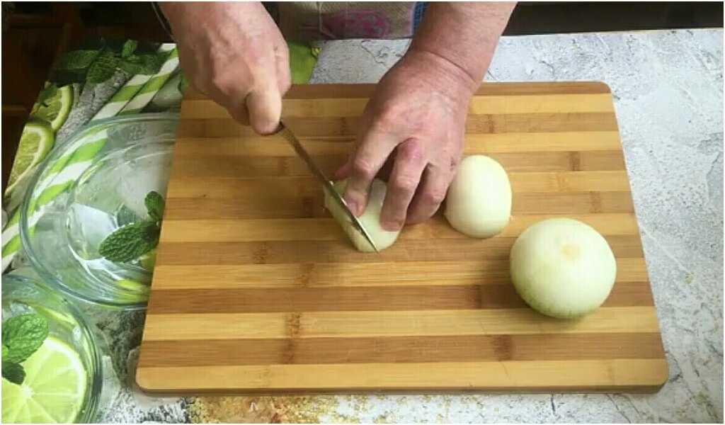 Лук очищаем от шелухи и нарезаем тонкими полукольцами.