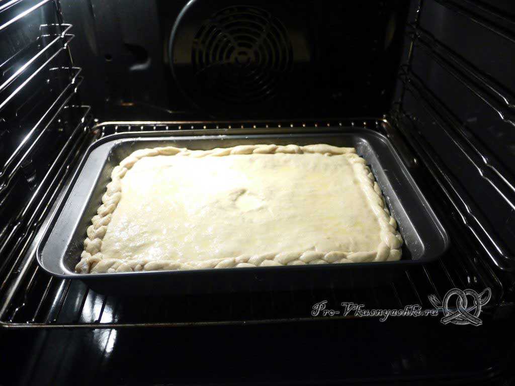 9. Повторно разогреть духовой шкаф и поставить в нее форму на 40-45 минут, чтобы пирог пропекся и покрылся нежной корочкой.