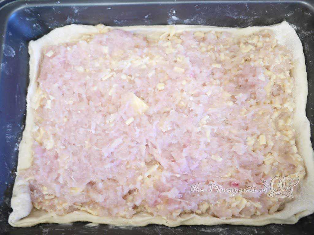 Приподнимая края переносим мучную основу в смазанную маслом посуду для выпечки, а на нее ровным слоем выкладываем фарш.
