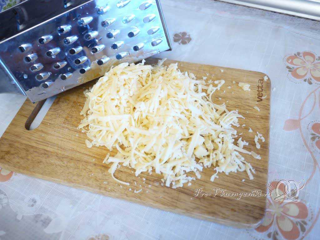 2. Половину сыра нарезать небольшими кубиками, а вторую часть при помощи терки превратить в стружку. Перемешивать между собой эти два виды нарезки лучше не надо, потому что они нам понадобятся раздельно для разных слоев.