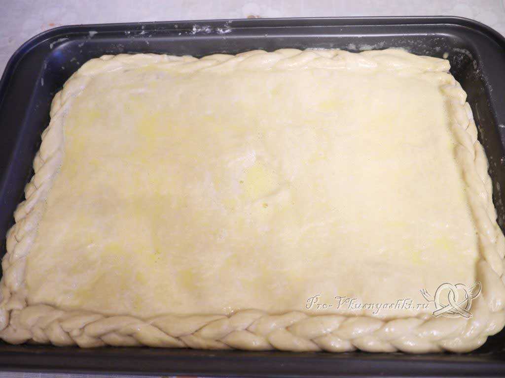Защипаем все края. Верх пирога можно украсить по желанию. Для этого скатаем из оставшегося теста жгутики, которые переплетем между собой и разложим по кругу пирога. В середине пирога сделаем отверстие для выхода пара. Оставим пирог еще на 20 минут для расстойки, а тем временем разогреем духовку до 180 градусов. Перед выпечкой смазываем весь пирог оставшейся яичной массой и ставим в горячую духовку.