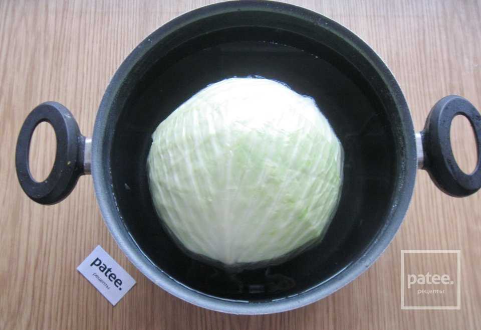 1. Налить в большую кастрюлю воду и дать ей возможность закипеть. Посолить по вкусу. Аккуратно, чтобы не обжечься, опустить в нее  капусту целиком, вновь дать воде закипеть и отварить 5 минут. После чего аккуратно достать,  дать стечь воде и немного остыть.