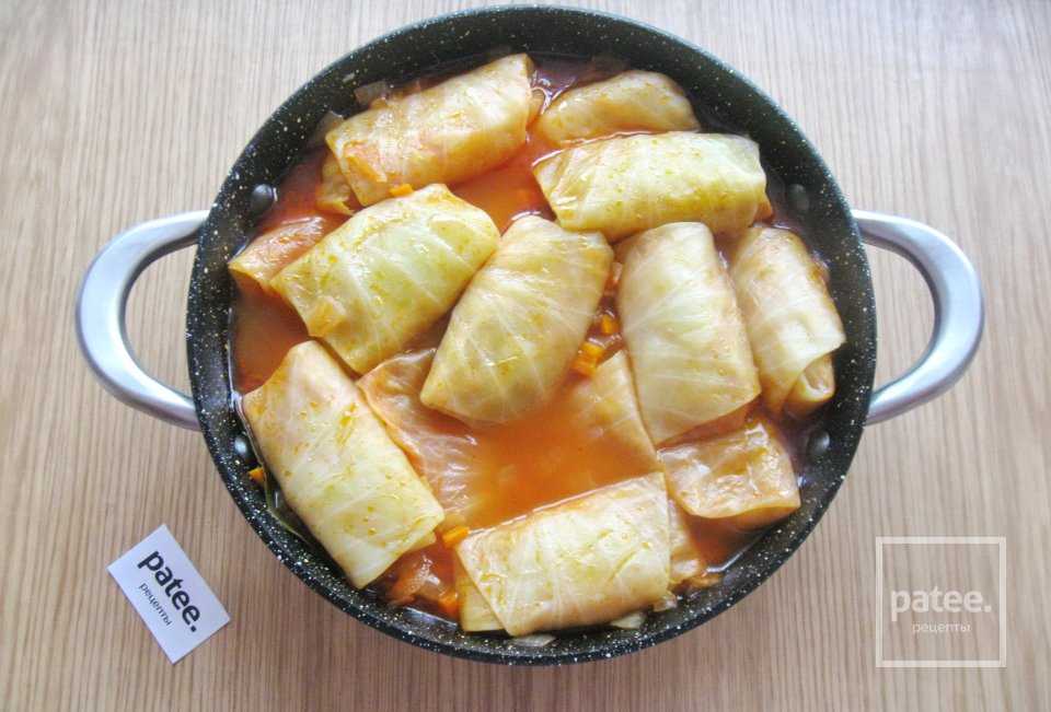 13. Перемешиваю, солю по вкусу. Заливаю голубцы подливой и оставляю тушиться на минимальном огне 45 минут.