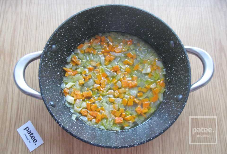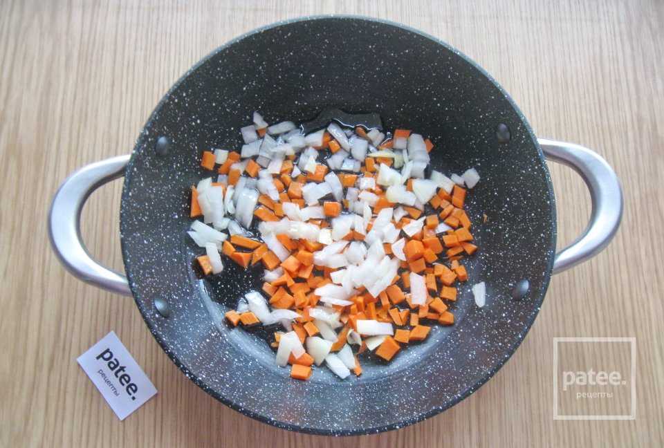 Лук и морковь очистите, помойте и нарежьте. Выложите в сотейник с толстым дном.