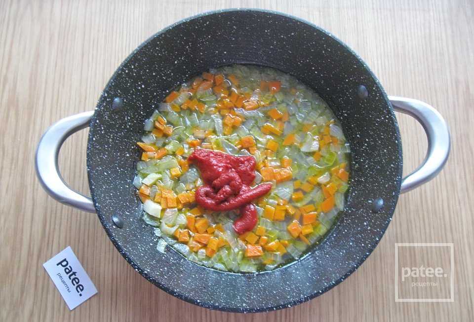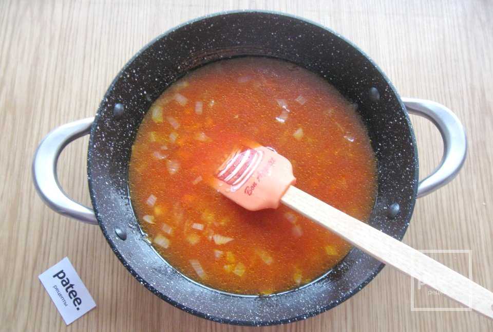 21. Добавить томатную пасту, специи и тушить на протяжении десяти минут, когда закипит;