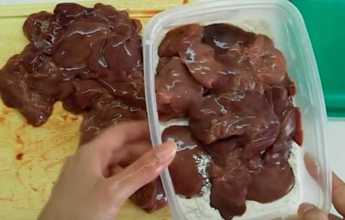 Печень промывают, откидывают на дуршлаг, чтобы излишки влаги стекали. После нарезают продукт на кусочки, обваливают в муке. Каждый ломтик должен быть в своеобразной панировке.