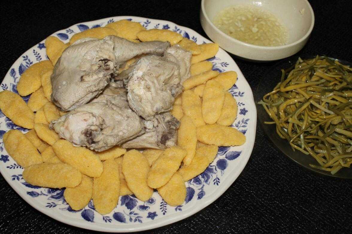 Ингредиент очистить от шелухи, растолочь и смешать с солью. Подготовить пиалы, в них налить немного бульона. Кукурузные галушки уложить на плоское блюдо, подавать с небольшими кусочками мяса. Чесночный соус подать в отдельной пиале. Можно дополнительно приготовить бульон Хьонк, блюдо отличается приятным вкусом, оно сытное и полезное.