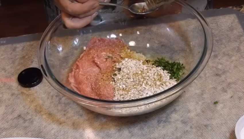 Овсянку (лучше взять ту, что нужно варить 3 минуты) залить водой, добавить соль, перец и взбитое яйцо. Пока овсянка замачивается, готовим фарш. Через мясорубку пропускаем мясо, лук и зелень.