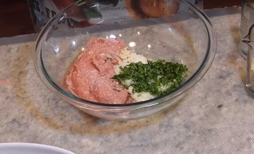 - Нарезаем петрушку, соединяем с фаршем, всё тщательно замешиваем.
