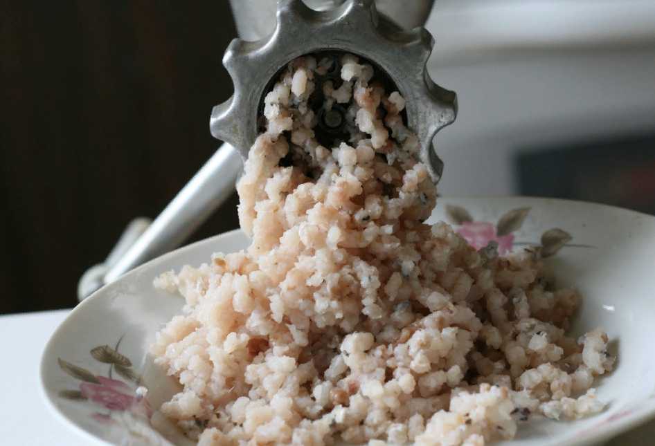 Но, если у вас уже разморозился брикет свиного фарша — не беда. Позаботьтесь о первом правиле всех фаршей — масса должна быть равномерной. А чтобы получилась равномерная масса, фарш перекручивается несколько раз, а вместе с ним красный лук и 4 зубца чеснока.
