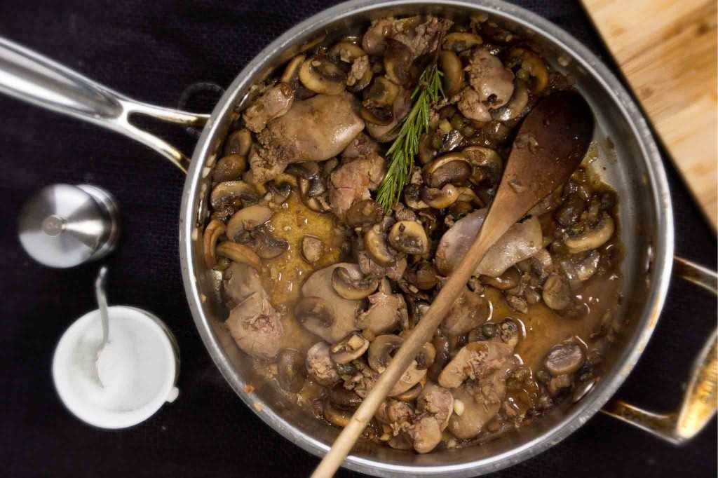 - В разогретую сковороду с маслом выложить печень. Прожарить ее 10 минут с обеих сторон. Засыпать грибы, лук. Все смешать. Выжать лимонный сок. Для этого блюда будет достаточно трети 1 лимона.