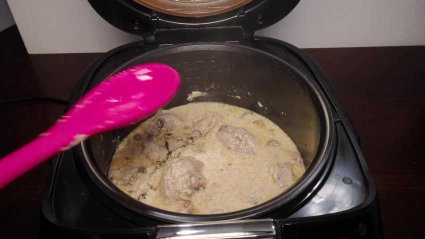 7. Сметану разведите водой, добавьте в эту смесь муку и хорошенько взбейте, чтобы не было комков. Залейте полученным соусом курицу с грибами и переведите устройство в режим «тушение» на сорок минут.