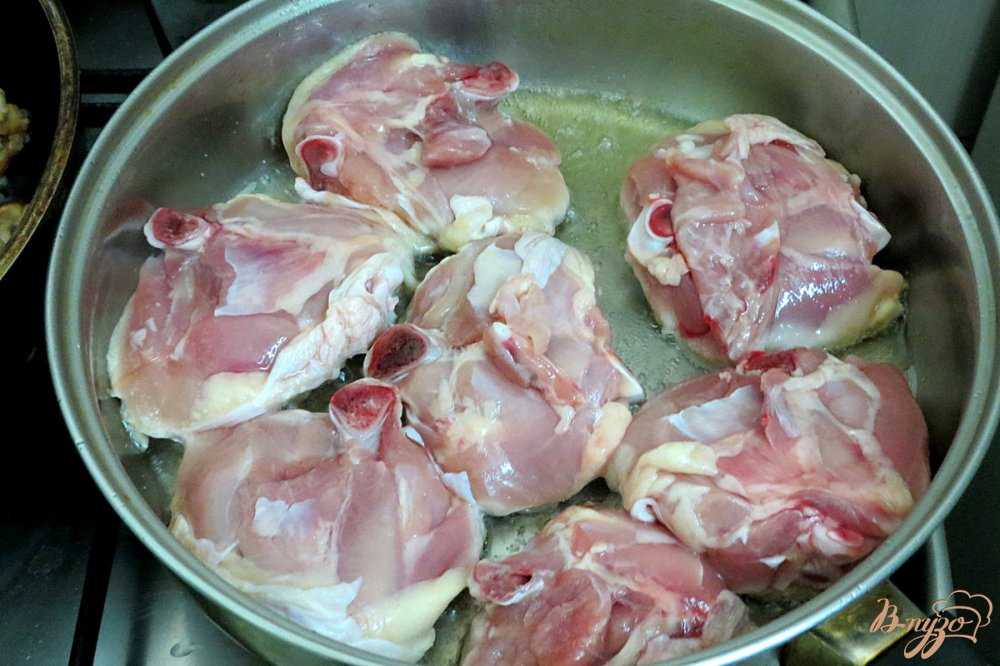 - Затем достаньте ветчину. Вместо нее положите куриные бедра. Обжаривайте до красивой румяной корочки, переворачивая из стороны в сторону.