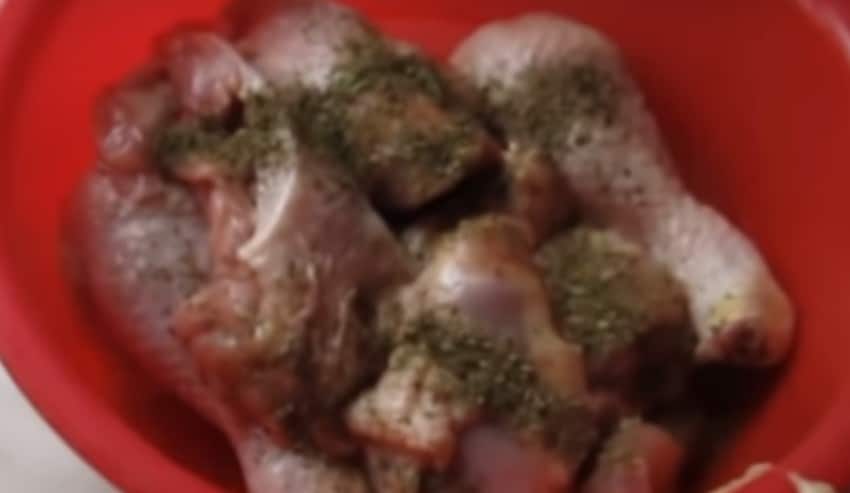- В небольшой миске или пластиковом пакете для хранения смешайте приправы: соль, перец, перец, чесночный порошок, луковый порошок. Добавьте курицу в приправу, если вы используете миску, или переложите курицу в пакет с приправой и встряхните, чтобы она полностью покрылась.