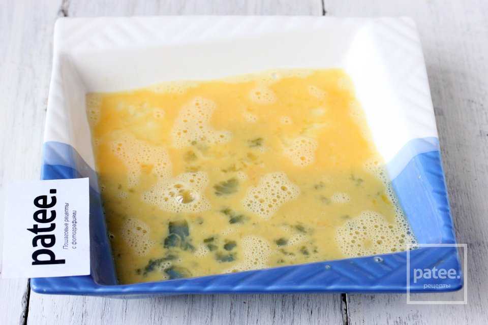 2. Затем в в любую глубокую чашку разбейте одно куриное яйцо С0 и взбейте его, добавьте остальные приправы и молоко, плюс куркуму и кориандр. Размешайте.