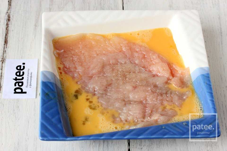 - Далее взбить яйцо миксером. Обмакнуть замаринованное филе в яичную массу, после чего обвалять в муке.
