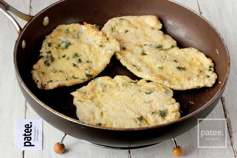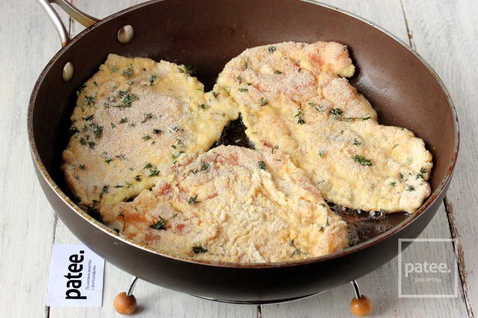 Сразу за первой панируем и выкладываем на сковороду остальные отбивные. Жарим куриные отбивные с одной стороны в течении двух-трёх минут, а затем переворачиваем.