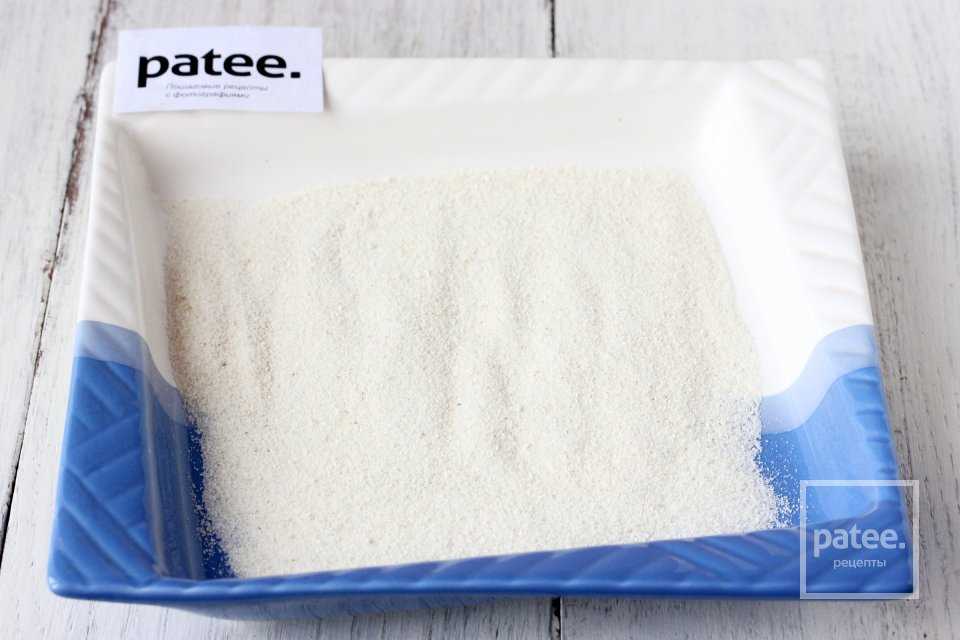 В другую плоскую миску с бортиками насыпаем манную крупу.
