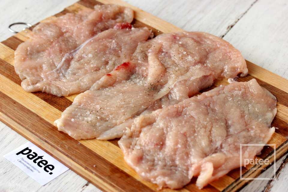 Отбиваем куриное мясо кухонным молотком, солим и посыпаем чёрным молотым перцем каждый кусок. Для того, чтобы легче было отбивать мясо, необходимо накрывать его пищевой плёнкой или полиэтиленовым пакетом.