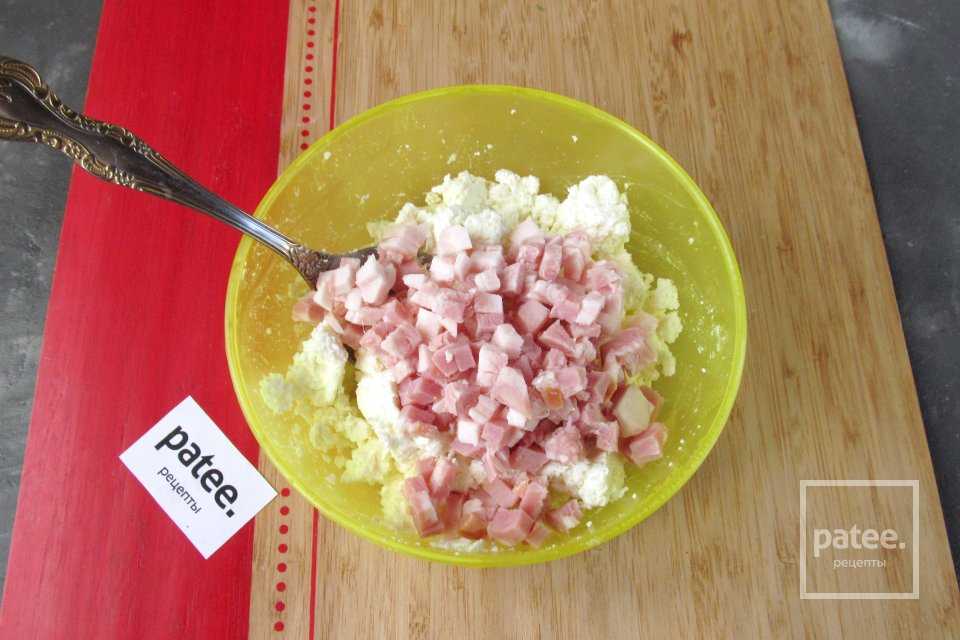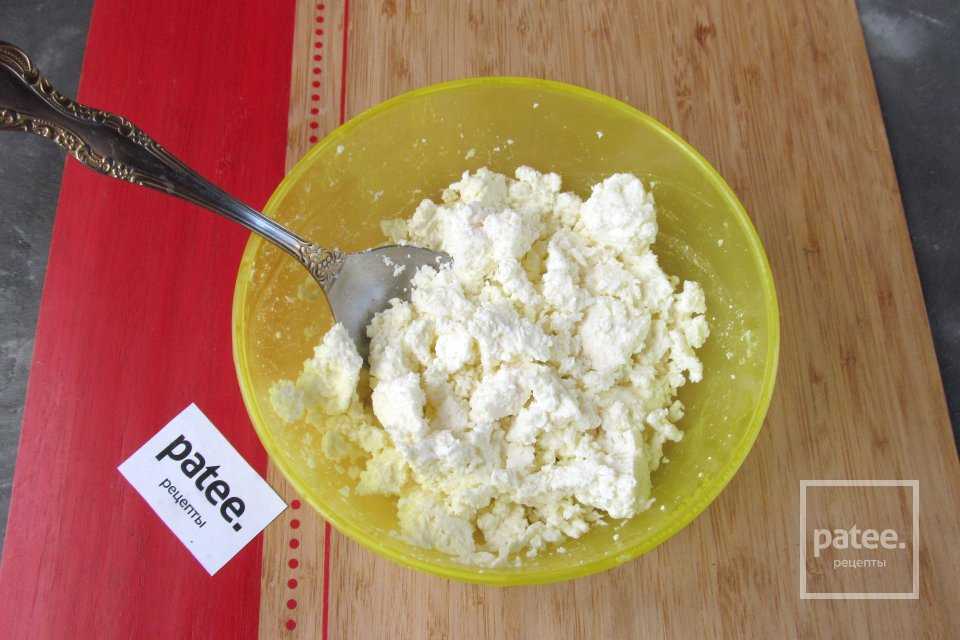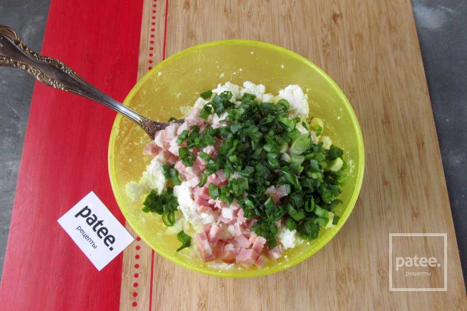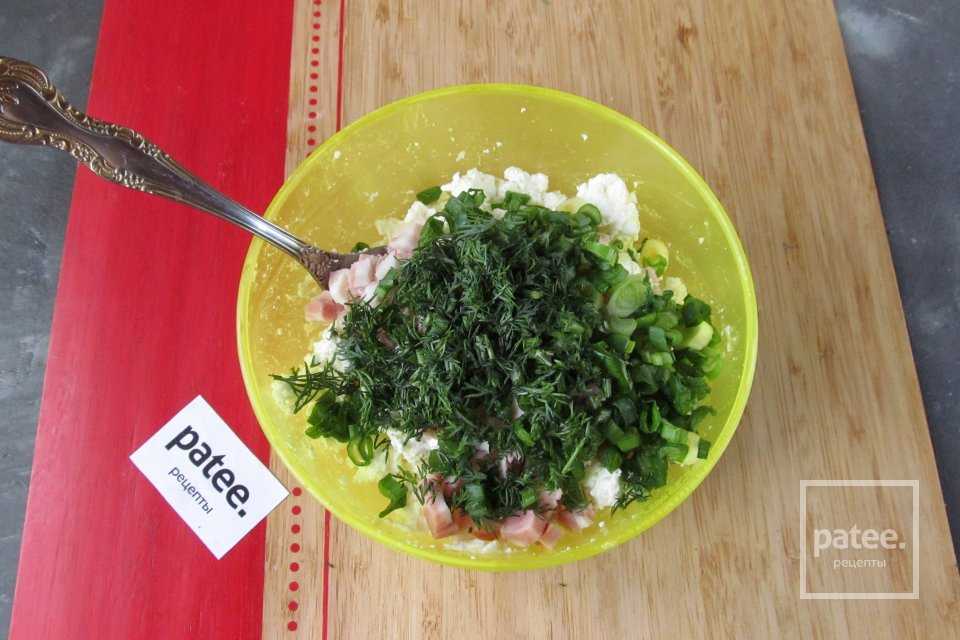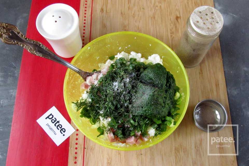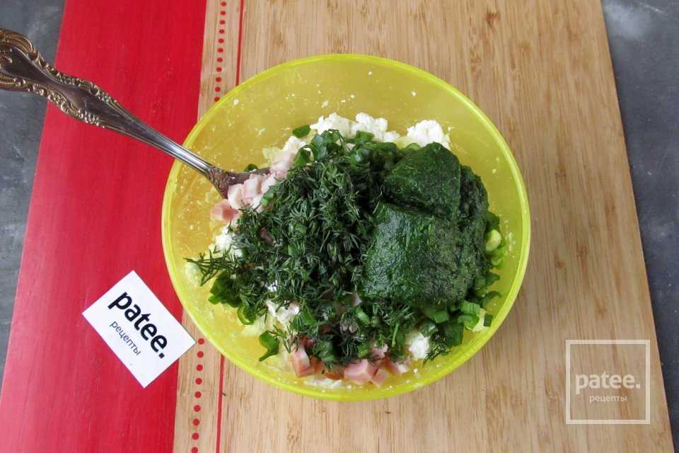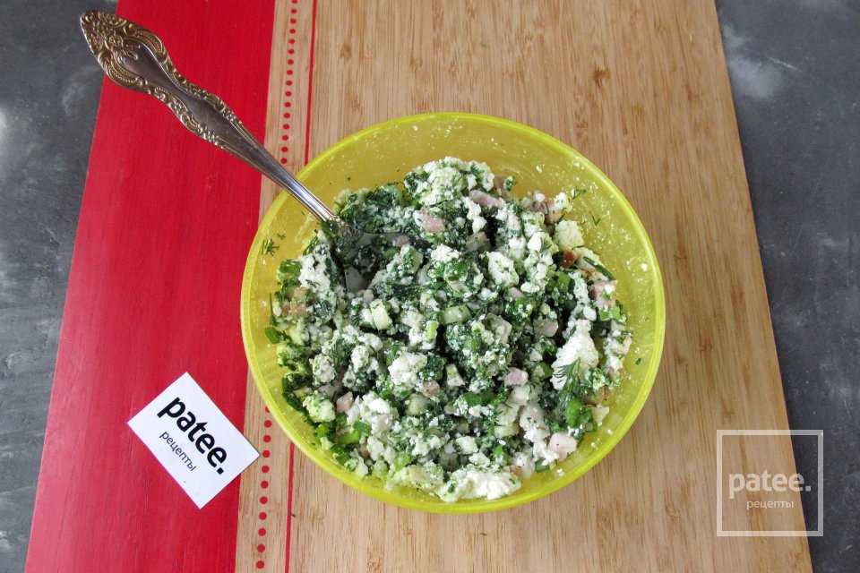 Теперь начинку из творога и зелени тщательно перемешиваем.