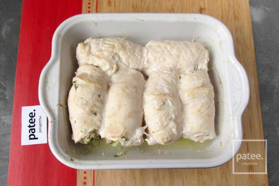 Таким образом заворачиваем остальные рулетки. Подготовленные куриные рулетки с начинкой выкладываем в форму для запекания. На дно наливаем немного холодной или горячей воды.
