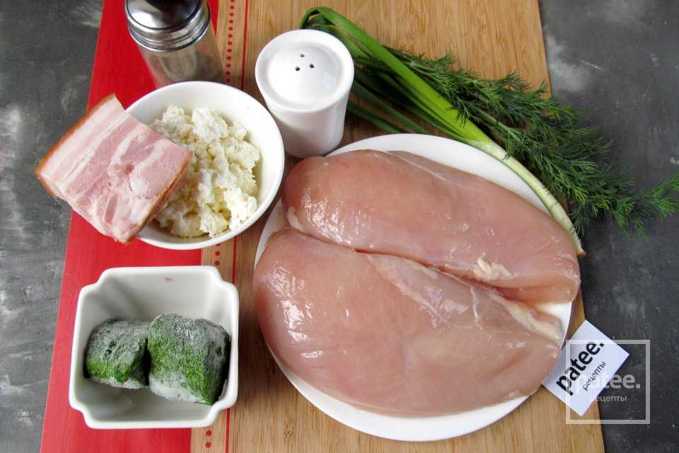 На подготовленные пластинки филе наносим тонким слоем творожный сыр, затем распределяем начинку из шпината. Сворачиваем филе в рулет и оборачиваем каждый рулетик в полоски бекона. Запекаем получившиеся полуфабрикаты в духовке около получаса при 200 градусах