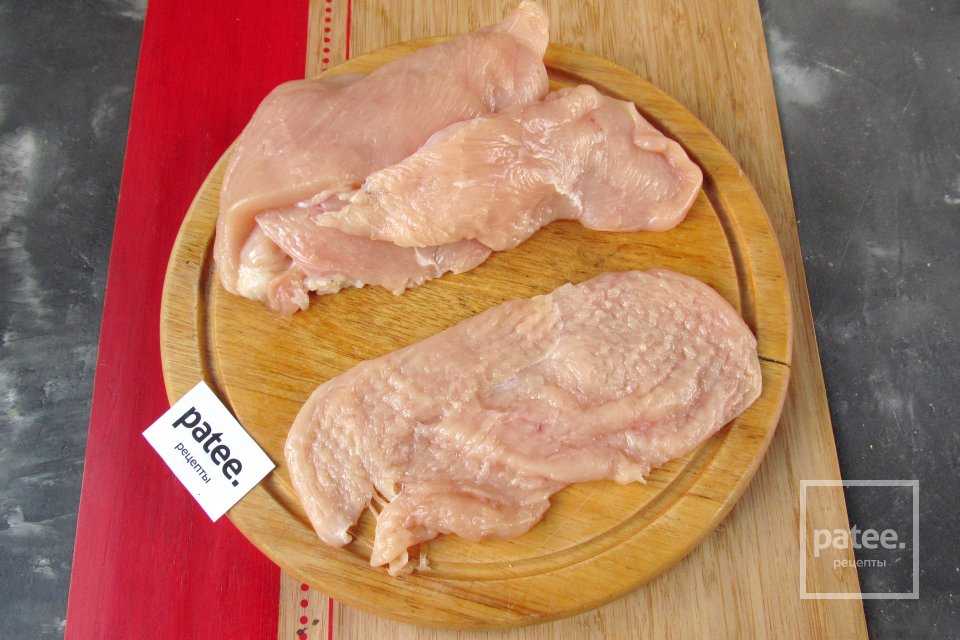 Куриную грудку разрезаем на два кусочка, слегка отбиваем. При желании можете немного посолить и добавить любимые специи.