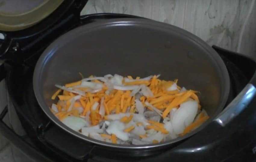 Моем чашу мультиварки, наливаем растительного масла, так, что бы донышко было покрыто маслом, включаем режим «Жарка» и сначала кладем чеснок, когда от него услышите аромат выкладывайте лук. Что бы лук приобрел тот самый «золотистый» цвет, слегка — именно слегка, без фанатизма посыпьте лук сахаром-песком.