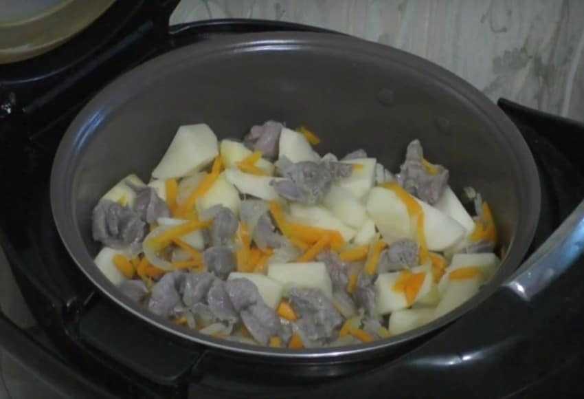Поставить режим мультиварки «Суп?Тушение» на 1 час, заложить в чашу отваренные субпродукты и луково-грибную зажарку.