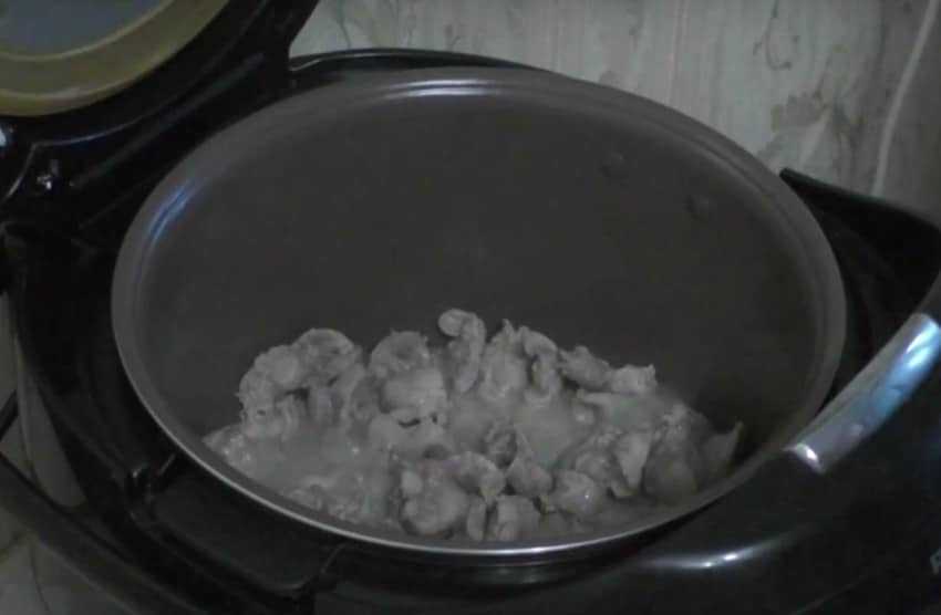 Залить всё смесью сливок и бульона от желудков, размешать и готовить, не открывая крышку, до звукового сигнала.