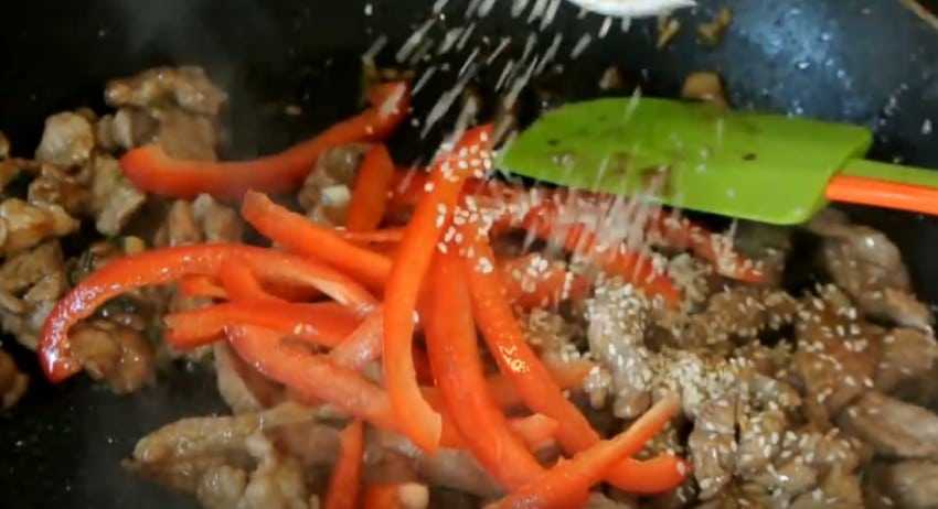 - Вводим соевый соус и кунжут. Перемешиваем ингредиенты.