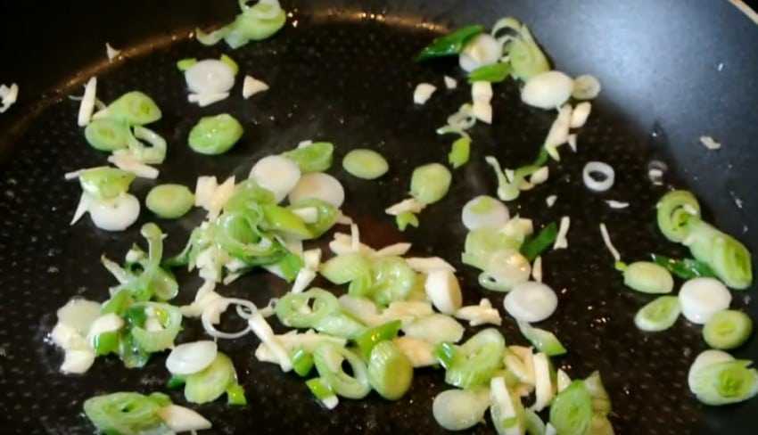 - На предварительно разогретую сковороду вок отправляем чеснок и имбирь, жарим их около 2 минут;